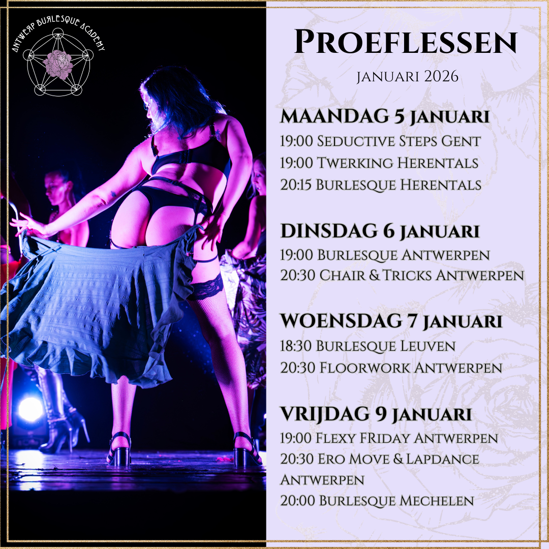 We organiseren opnieuw proeflessen voor de nieuwe lessenreeksen – januari t.e.m. april 2026. We nodigen jou graag uit om kennis te maken met burlesque en andere.